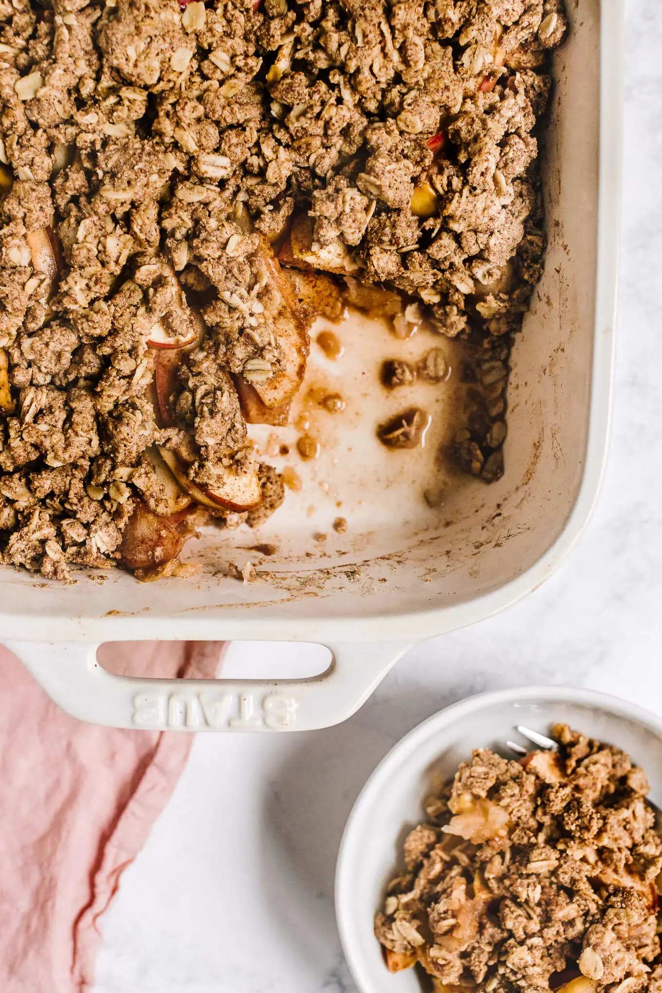 The addition of almonds to apple crisp is not a revelation. The nutty flavor of almonds pairs perfectly with the sweet apples. To make sure the almond flavor is prominent, a significant amount of almond flour or ground almonds is used to replace traditional flour.