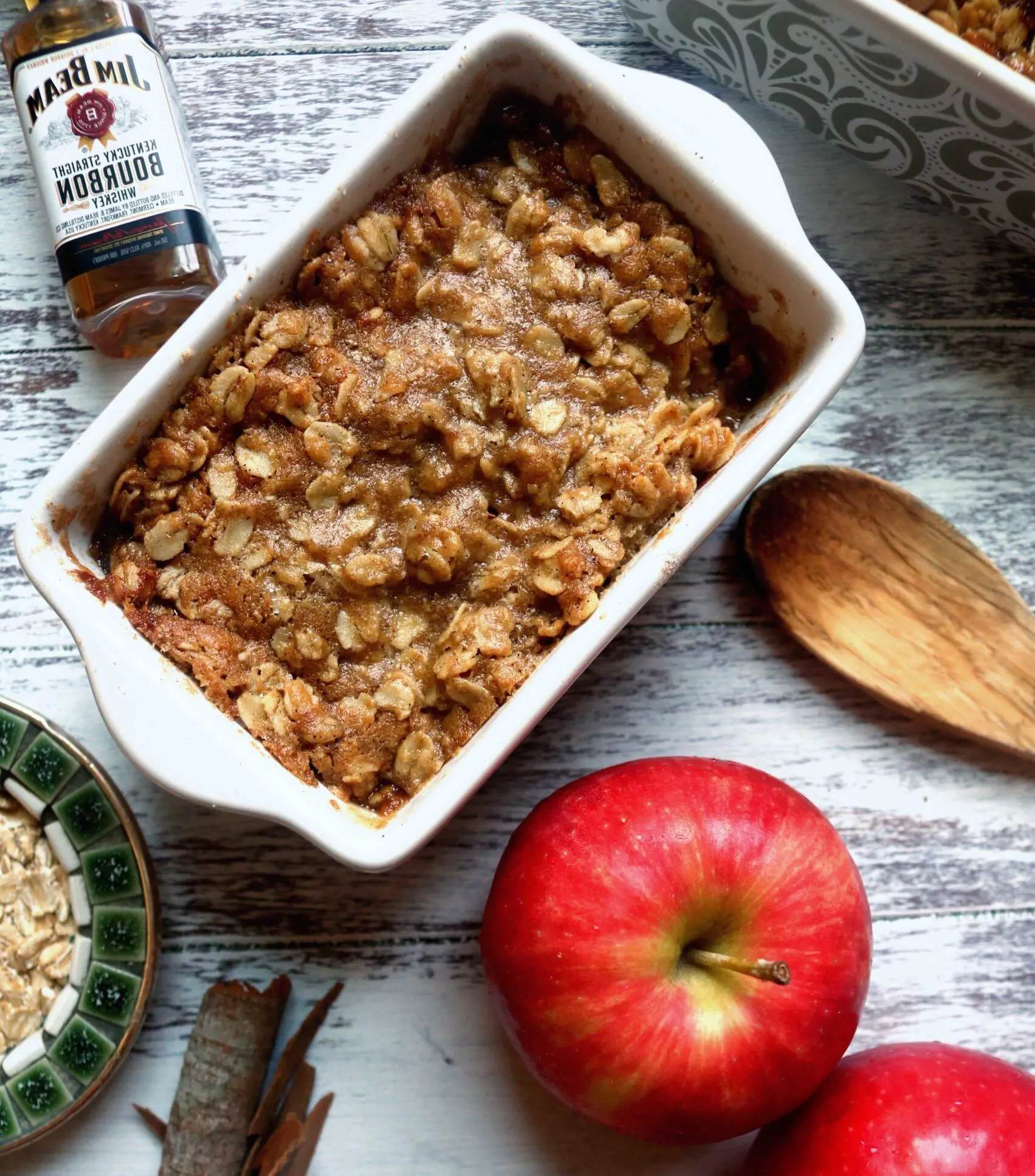 The next recipe on our list is the addition of bourbon to an apple filling for a rich, warm undertone to contrast the sweetness of the fruit. This variation brings a touch of sophistication and depth of flavor to the traditional apple crisp.