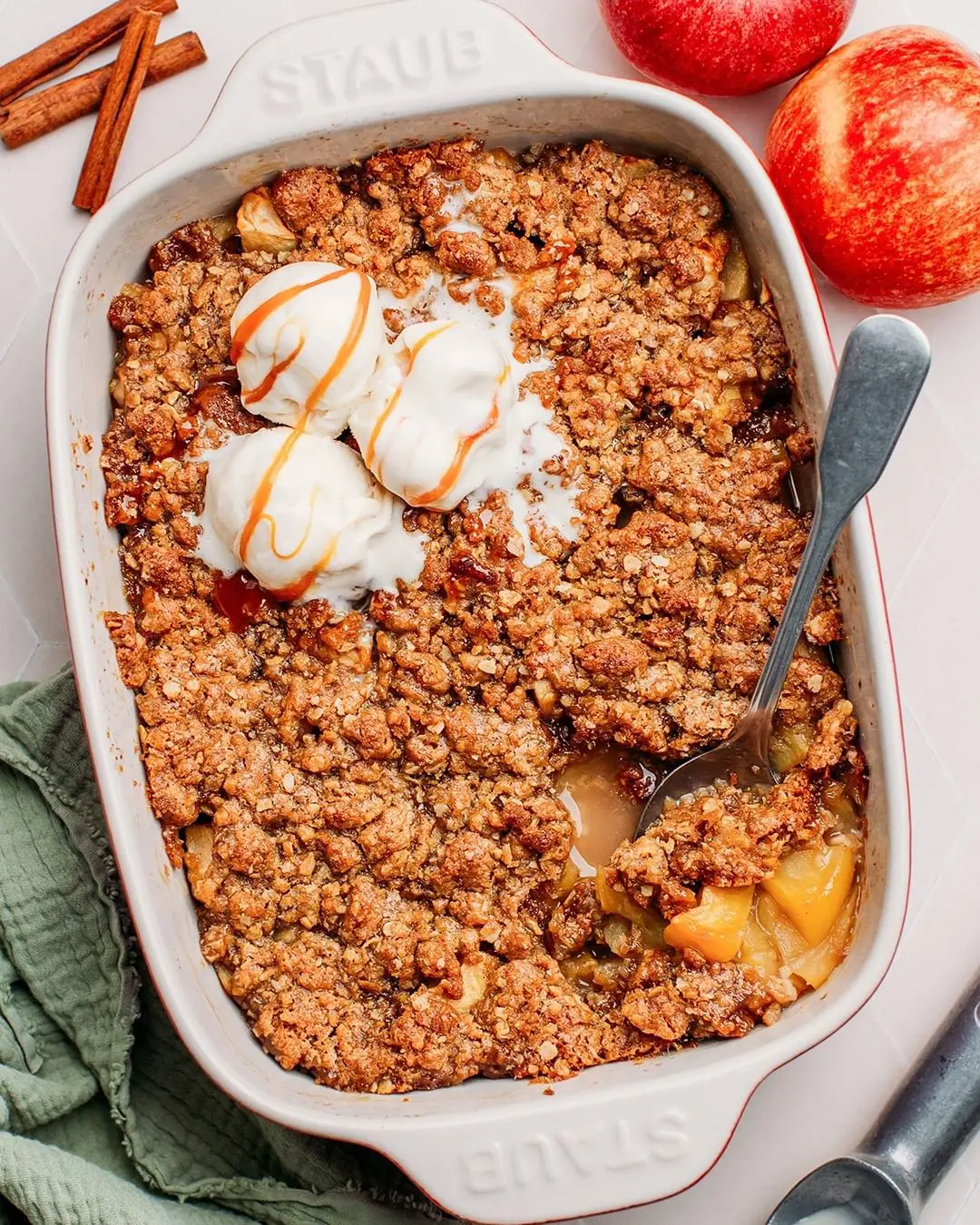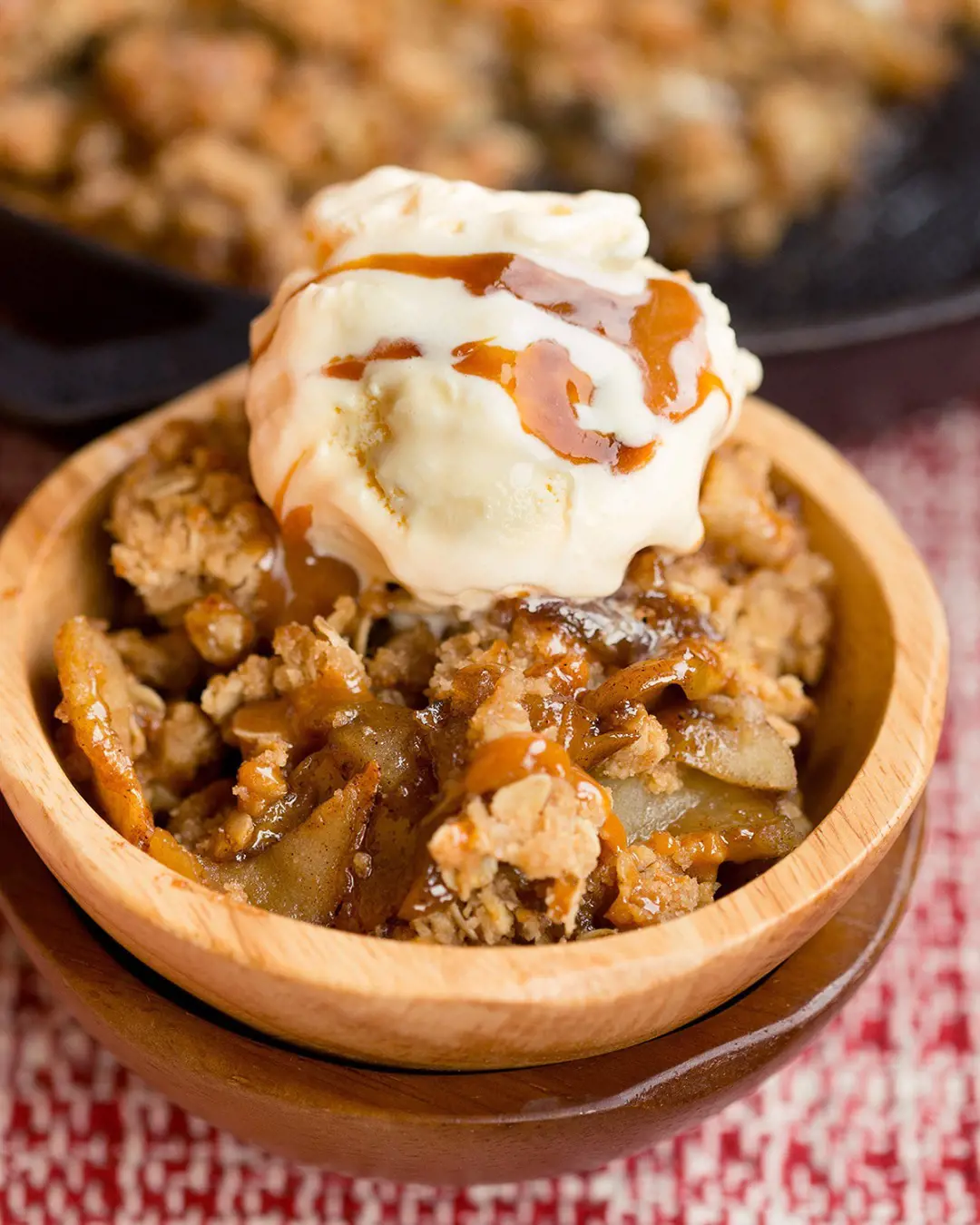 The sauce is prepared by melting butter and brown sugar together. It adds a gooeyness that goes with the crisp topping for a textural contrast. On top of this layer sits a crumble topping. With a scoop of vanilla ice cream or a dollop of whipped cream, Caramel Apple Crisp becomes a decadent treat perfect for special occasions.