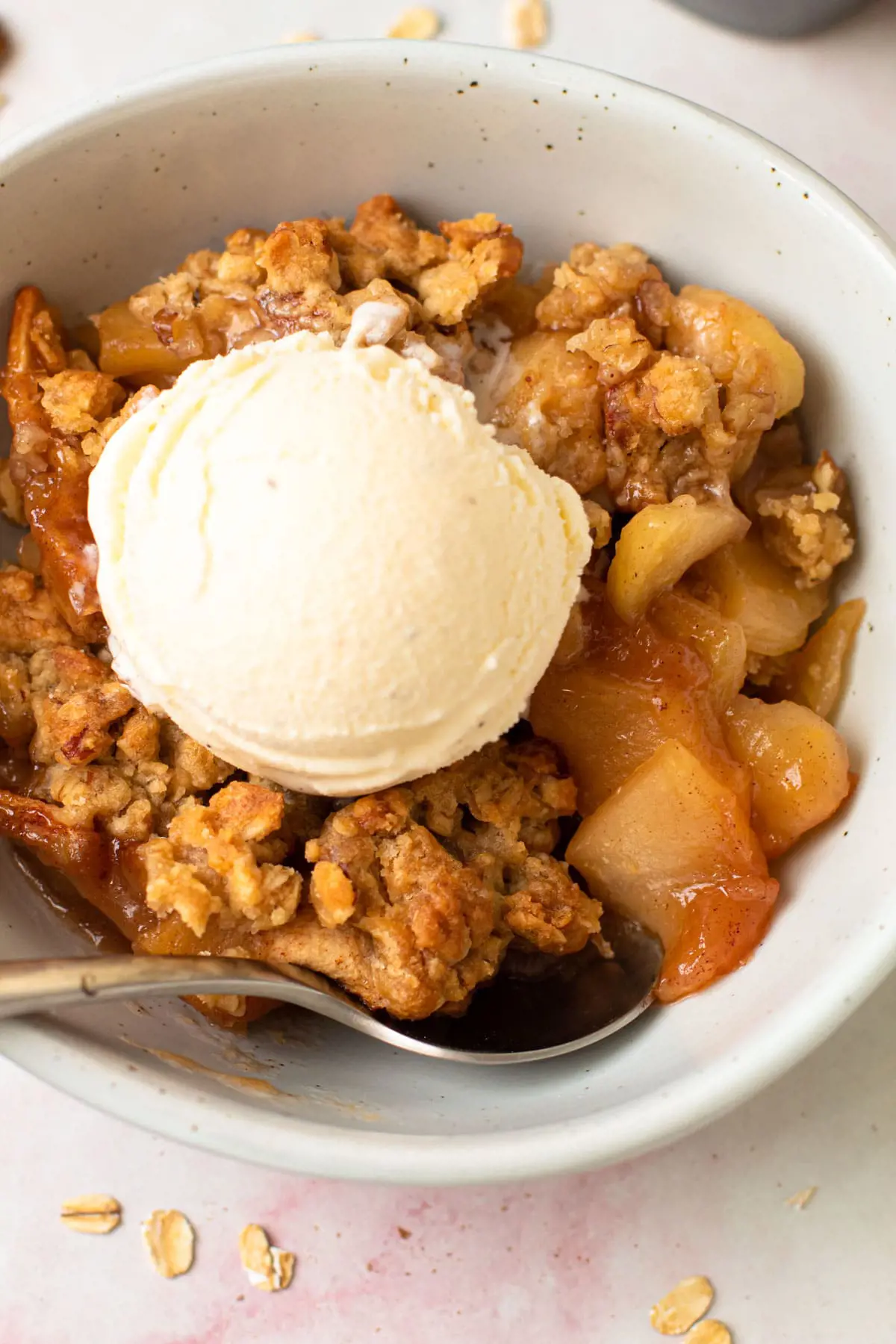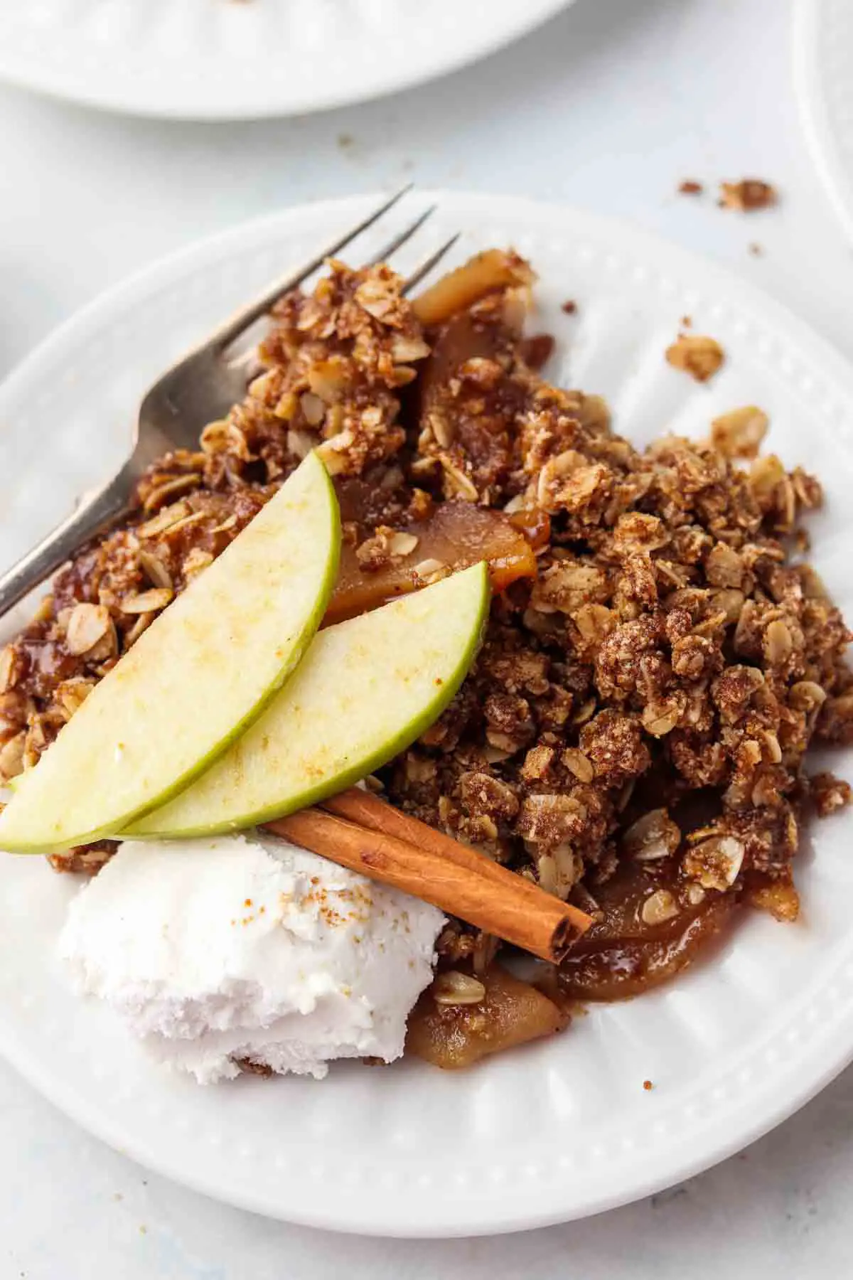 These apple slices are then topped with a mixture of flour, oats, brown sugar, butter, and more cinnamon, creating a crumbly and golden topping. The natural sweetness of the apples pairs perfectly with the warming embrace of cinnamon. The topping adds a pleasant crunch that contrasts beautifully with the soft, tender fruit beneath.