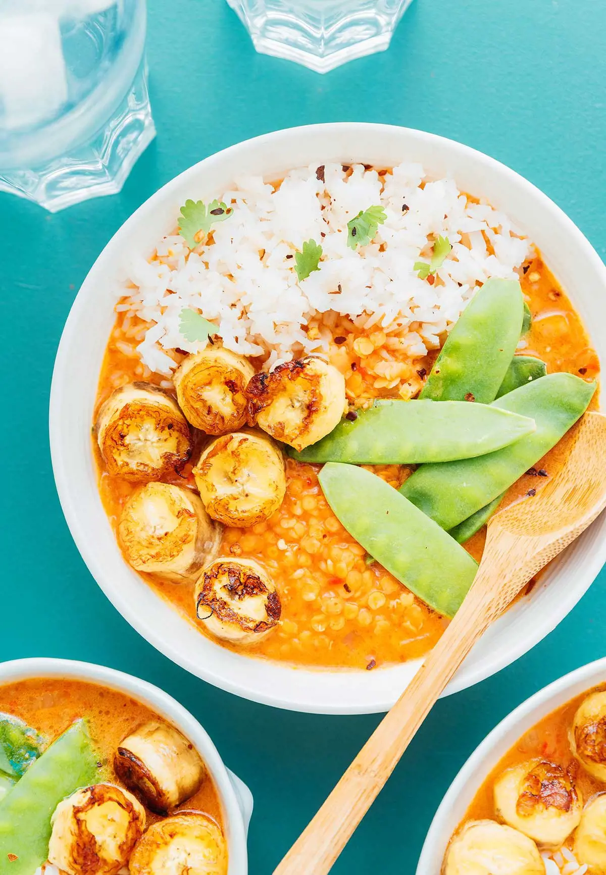 The dish typically features a blend of spices and can be prepared with a variety of vegetables, meats, or lentils. Here, the bananas add a creamy texture and natural sweetness to the curry, complementing the bold flavors of the spices.