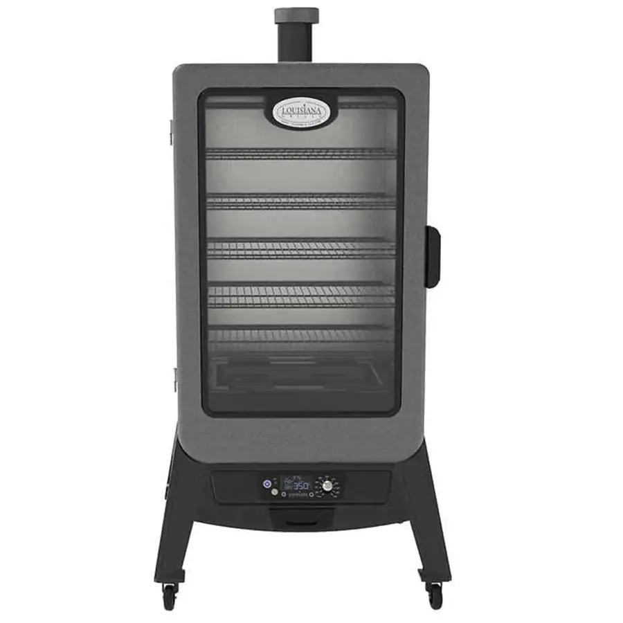 The 7-series vertical pellet smoker from Louisiana Grills comes with two fully functional meat probes. Porcelain-coated steel forms the grid while the primary body is constructed with heavy-duty steel. The double-walled insulation allows you to smoke at a high temperature and the large front window makes cooking fun.