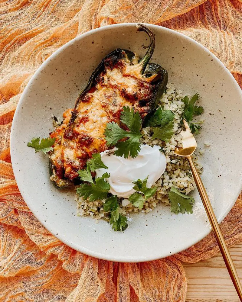 This savory delight showcases Poblano peppers generously filled with a delectable blend of seasoned vegetables. The possibilities are boundless, featuring a delightful mix of grated mushrooms, carrots, riced cauliflower, corn, jalapeno, bread crumbs, and Mexican blend cheese.