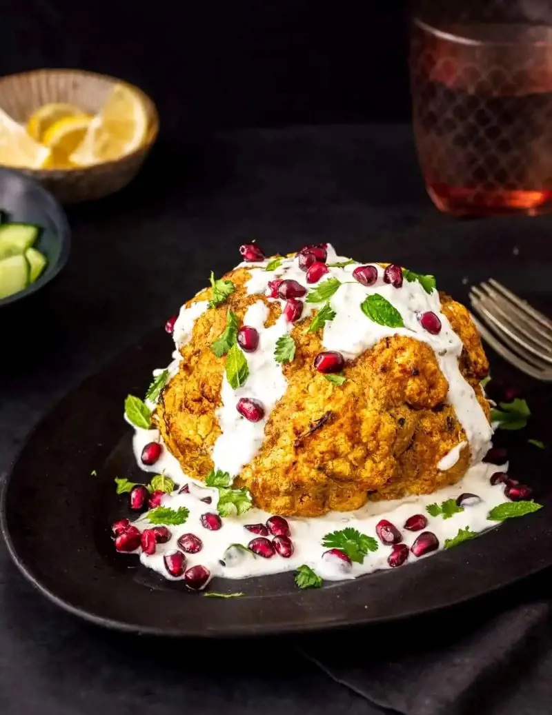 For a last-minute Indian-inspired Vegetarian showstopper for Thanksgiving, present an Air Fryer Whole Roasted Cauliflower. Elevate this humble vegetable by marinating it in a blend of Indian spices, yogurt, and herbs, creating rich flavors.