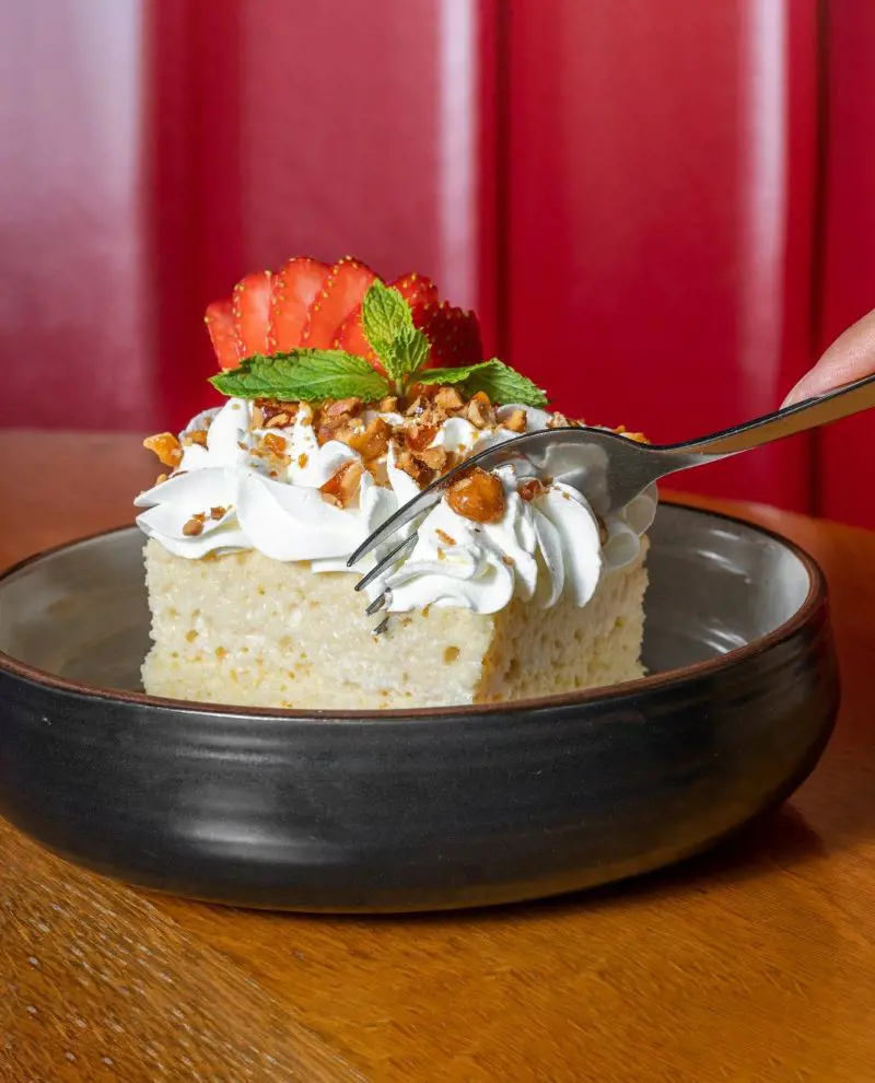 Introducing Tres Leches—a luscious vanilla cake soaked in a delightful trio of milk blends. Topped with luxuriously smooth vanilla whipped cream and adorned with caramelized hazelnuts, each bite is a symphony of textures and flavors.