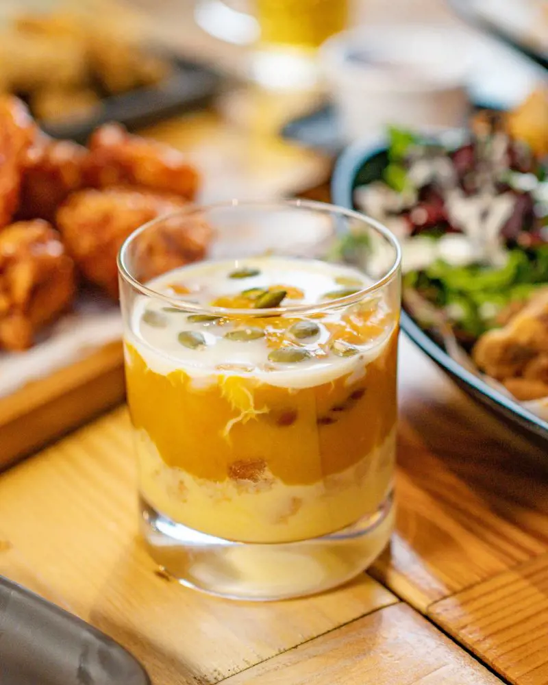 A divine dessert, Pumpkin Mousse layers sweet pumpkin goodness with velvety vanilla custard, crispy bread croutons, and a drizzle of condensed milk. Garnished with pepitas for the perfect finishing touch, this sweet and rich treat strikes a delightful balance of flavors and textures.