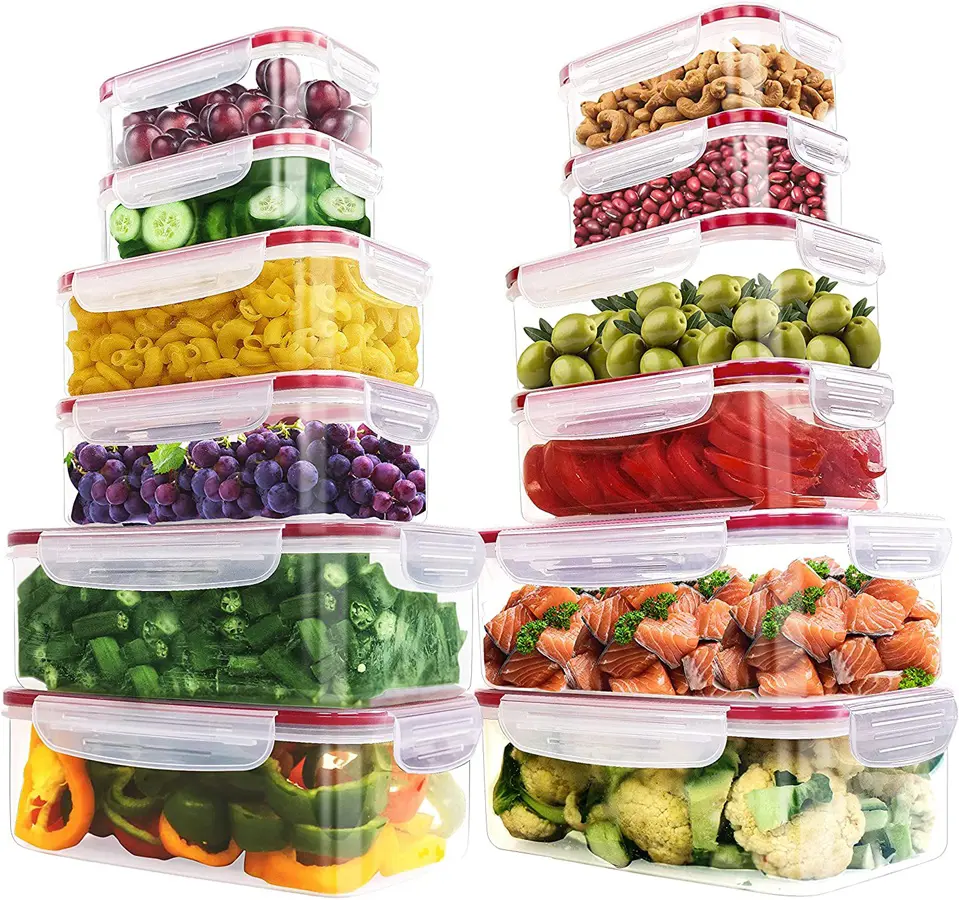 The 24-set food containers from Vtopmart are one of the most popular sets. The set comes in 4 different sizes: 6 Tall Container (2.5quart/2.8 liters), 6 Large Containers (1.8quart/2.0 liters), 6 Medium Containers (1.5quart/1.6 liters), 6 Small Containers (0.7quart/0.8 liters) making it suitable for storing everything you want.