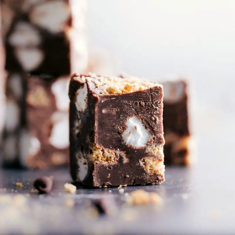 The name Rocky Road indicates the presence of chopped nuts and marshmallows. To make the recipe, you start with a mixture of milk chocolate chips, sweetened condensed milk, and butter. Marshmallows and chopped nuts are then folded in. What results is a velvety, indulgent fudge loaded with texture and flavor.