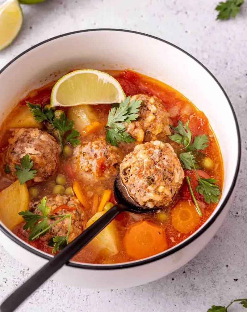 The meatballs are cooked in a savory broth along with vegetables like carrots, potatoes, zucchini, and tomatoes. The broth is often flavored with herbs like cilantro and can have a tomato base. It's a popular dish often served during family gatherings, celebrations, or simply as a warming and satisfying meal.