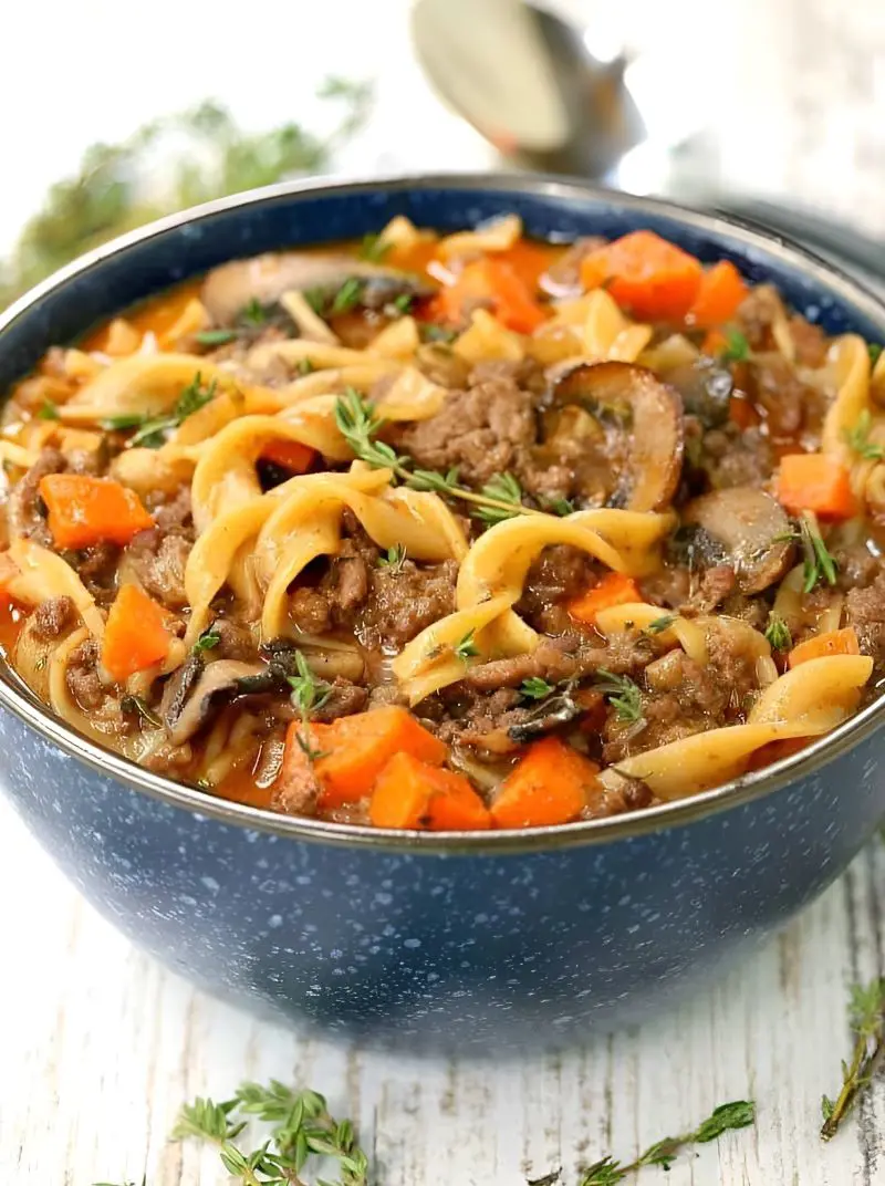 This beef burgundy mushroom soup is enriched with egg noodles and fresh thyme. It's a simple one-pot dish that brings together ground beef, mushrooms, egg noodles, beef broth, carrots, onions, and fresh thyme.