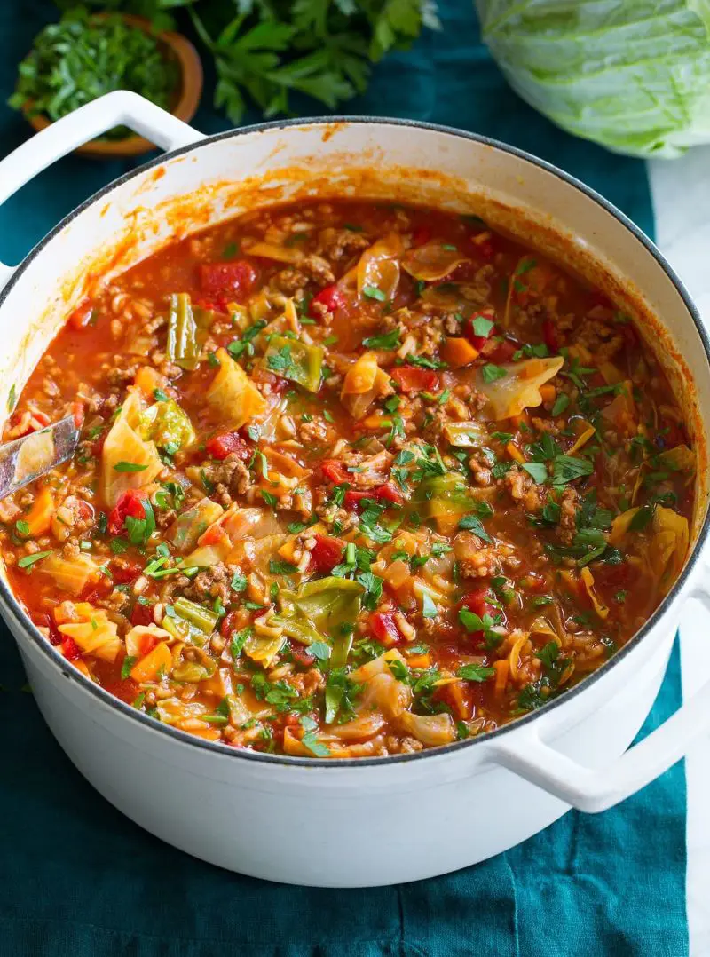 A hassle-free delight, this one-pot cabbage roll soup recipe offers quick and efficient preparation. Begin with a swift assembly of ingredients, sauté the veggies, and let everything simmer until the cabbage and rice achieve tender perfection.
