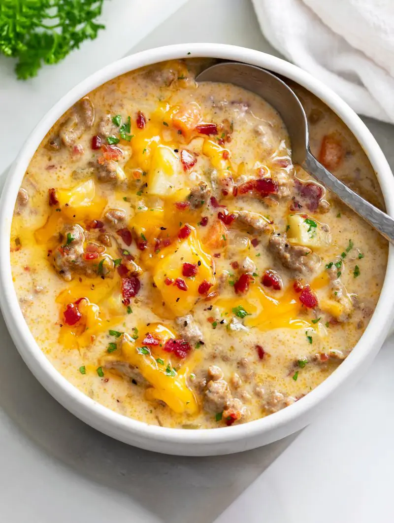 Thick, creamy, and irresistibly cheesy, cheeseburger soup is a guaranteed crowd-pleaser! The flavor profile is impeccably balanced, with ground beef, cheese, potatoes, and onions harmonizing seamlessly. Each spoonful of this soup delivers hints of the classic cheeseburger flavor.