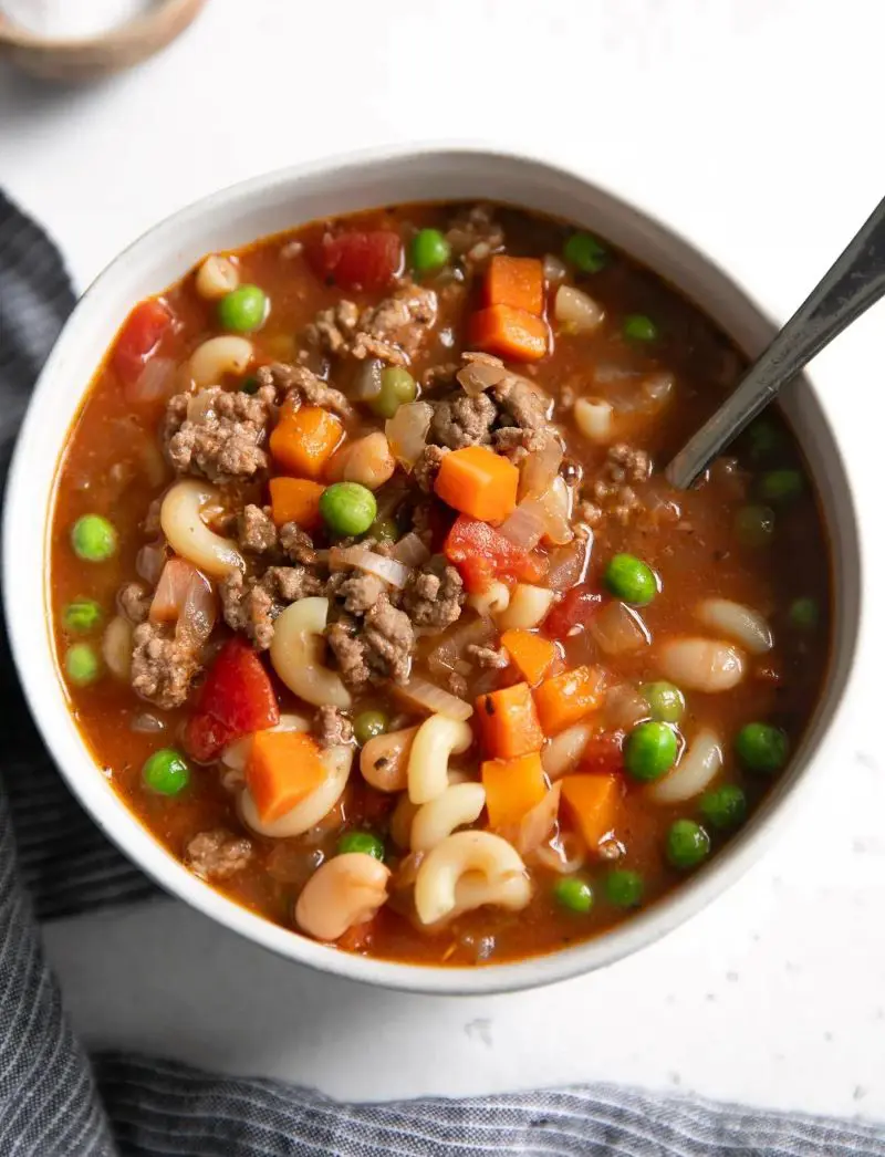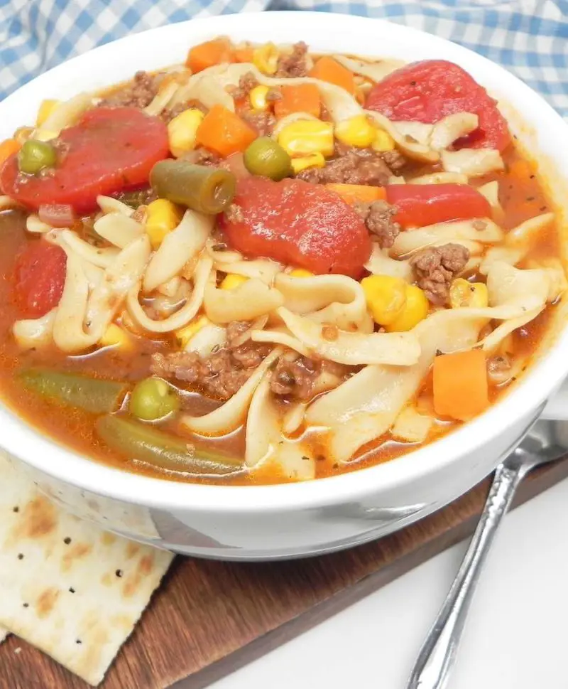 To prepare this comforting bowl of soup, ground beef is browned and simmered in a rich tomato broth with chunky vegetables such as potatoes, carrots, and peas. Tender egg noodles join the party in the final stretch, creating a satisfying and hearty meal.