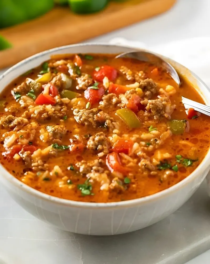 This hearty stuffed pepper soup is a satisfying meal filled with ground beef, onions, rice, and bell peppers, all immersed in a flavorful tomato-based broth. It captures the essence of classic stuffed peppers without the fuss. As a bonus, it's Crock Pot friendly, and you have the option to choose ground turkey instead of ground beef for a lighter twist!