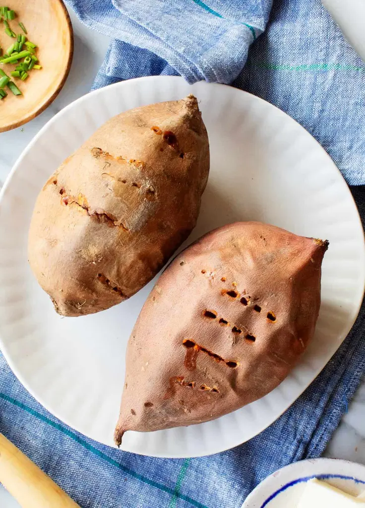 After baking, allow the sweet potatoes to cool slightly. This cooling period makes them easier to handle and allows the internal temperature to stabilize. Once they're cool enough to touch, split the tops open with a knife. The steam that escapes will help fluff up the interior.