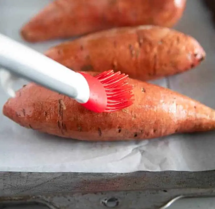 A basting brush or paper towel is used to apply olive oil evenly over the surface of the sweet potatoes before baking. This helps crisp up the skin and adds flavor.