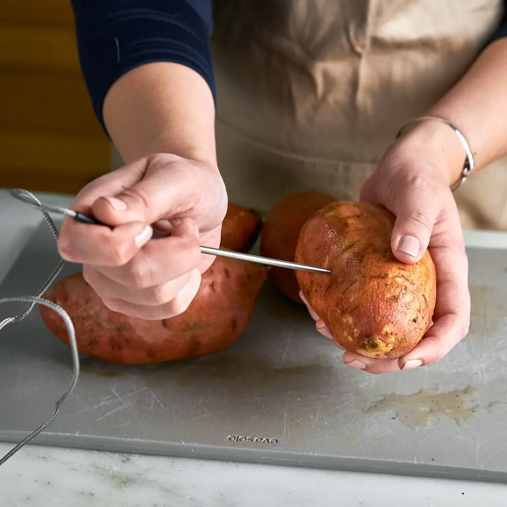 A sharp knife is needed to slit open the baked sweet potatoes once they're cooked. This allows steam to escape and makes it easier to add toppings or mash the interior.