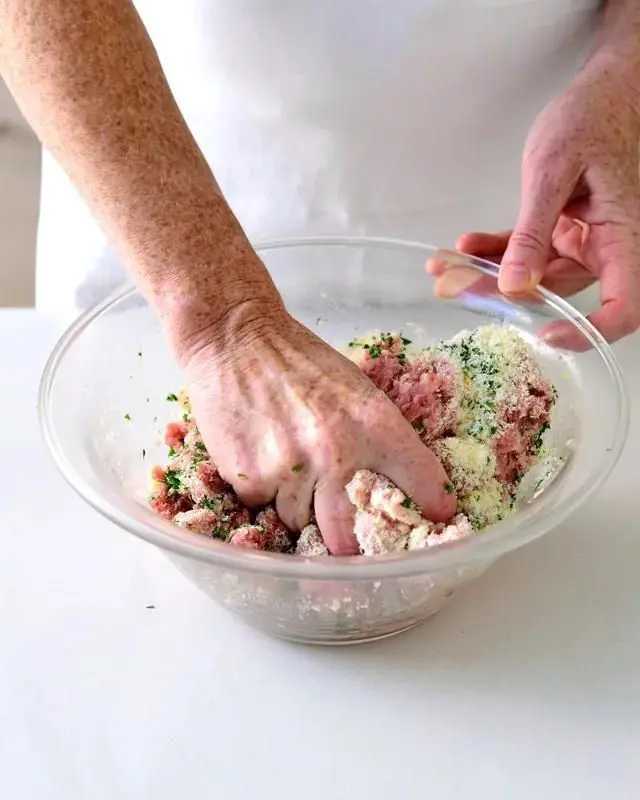 In a large mixing bowl, add the ground meat, soaked breadcrumbs, egg, onion, garlic, Parmesan cheese, parsley, salt, pepper, and Italian seasoning. Use your hands or a fork to gently mix everything until just combined. Overmixing can result in tough meatballs, so mix until the ingredients are evenly distributed.