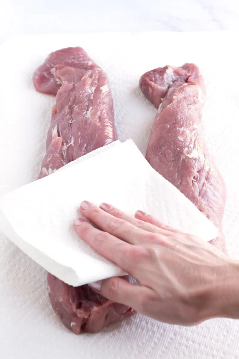 The second step is to prepare the pork tenderloin. Start by unpacking the meat and place it over the baking paper on a clean surface. Then, use a paper towel to pat the steak dry to remove the excess moisture or oil.