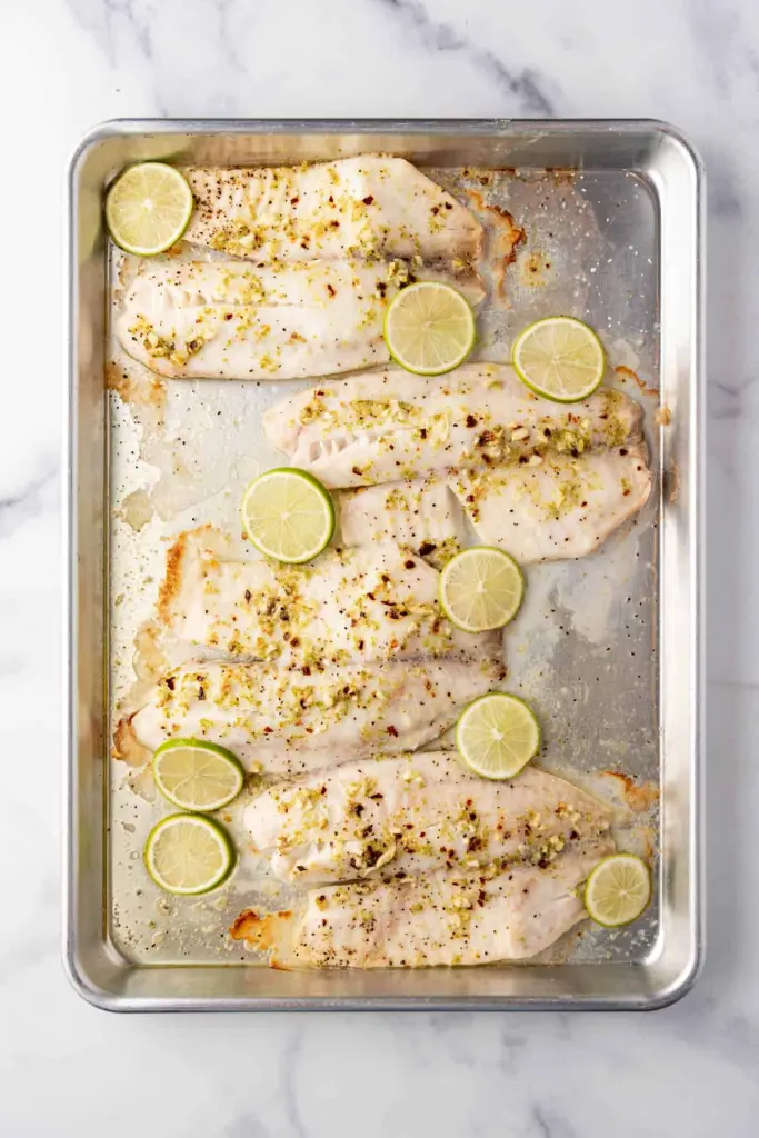 Use a spoon to baste the fillets with any sauce that runs off onto the baking sheet. Take your whole lemon and slice it into thin rounds. Place these lemon slices on top of and around the tilapia fillets. This not only looks attractive but will infuse the fish with more lemon flavor as it cooks.