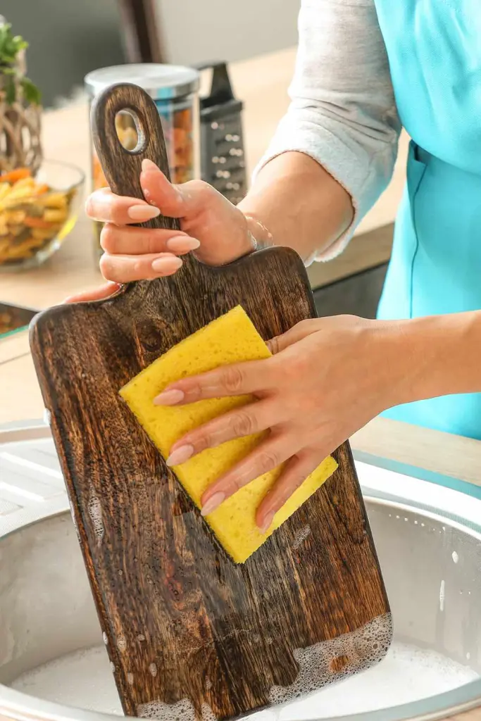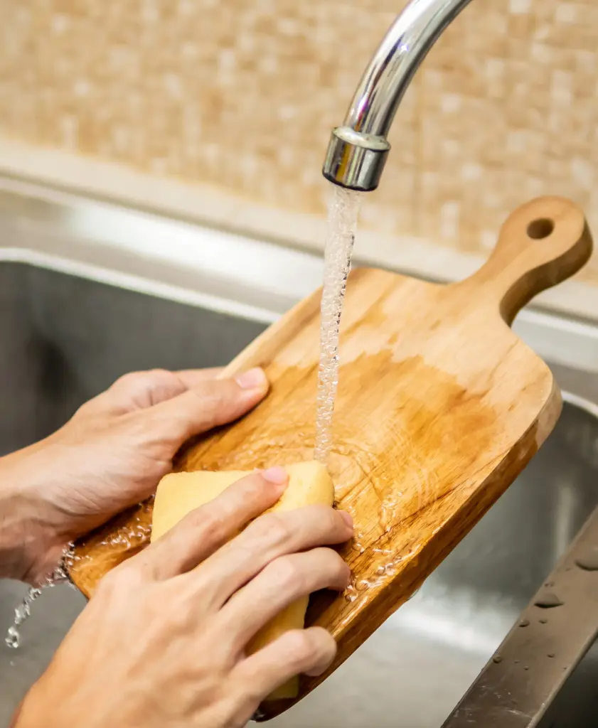 Start by cleaning the board with dish soap. Rinse it under hot water, apply dish soap, and scrub thoroughly with a sponge or dish brush. This removes surface dirt and prepares the board for sanitization.
