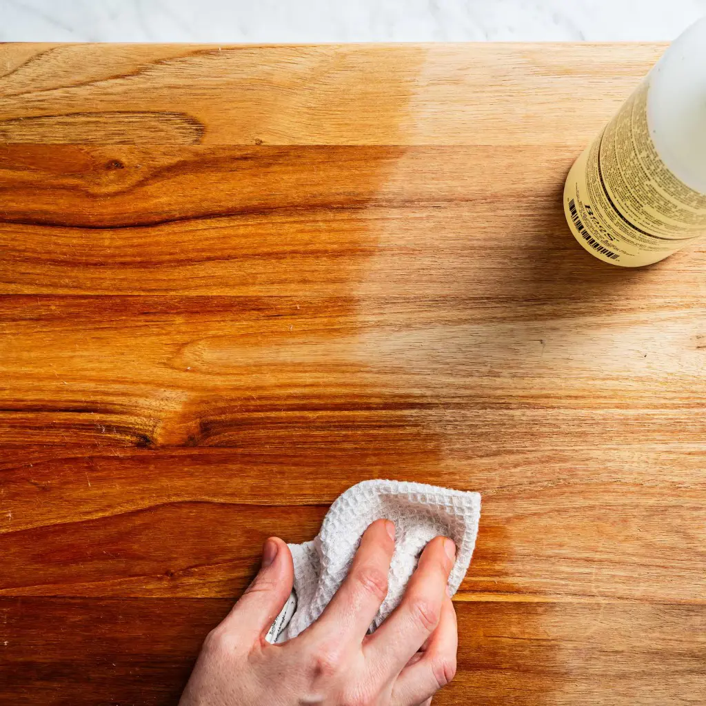 Apply food-grade mineral oil or beeswax once a month. This protects the wood and creates a barrier against water and stains. Use a clean cloth to rub the oil into the wood grain, then wipe off any excess.