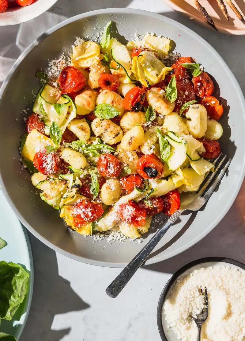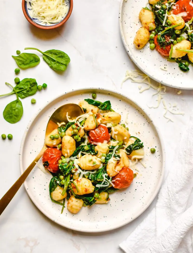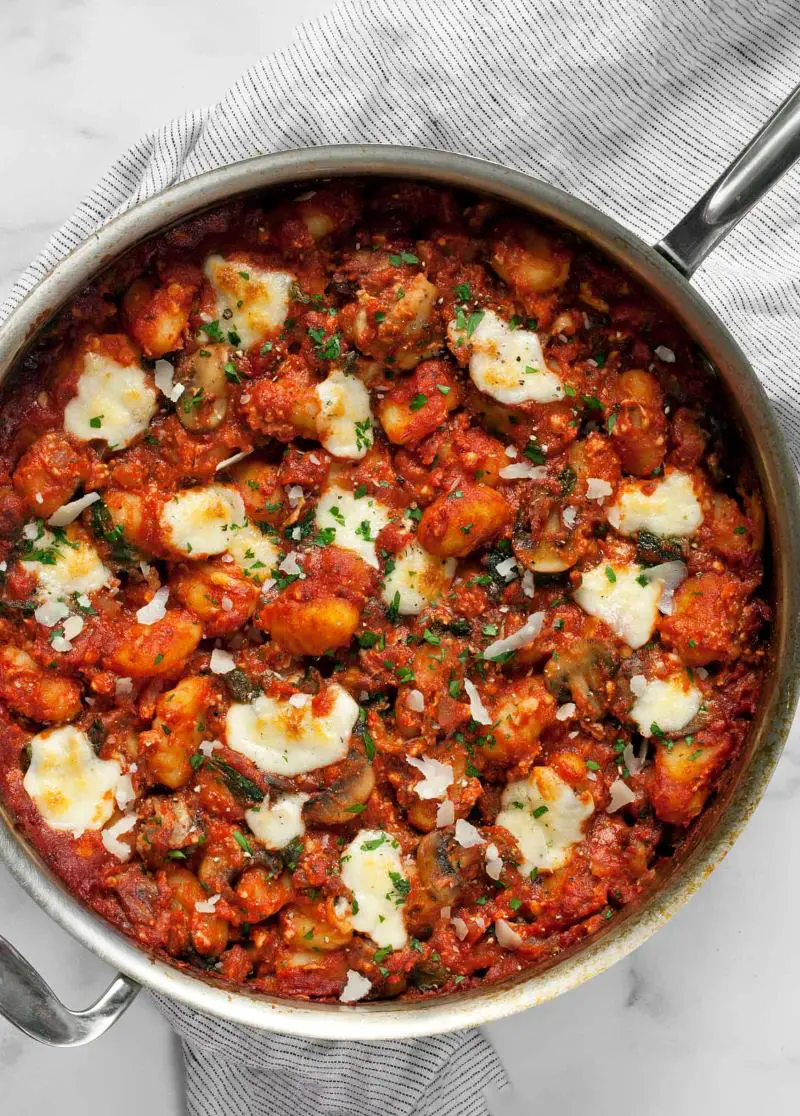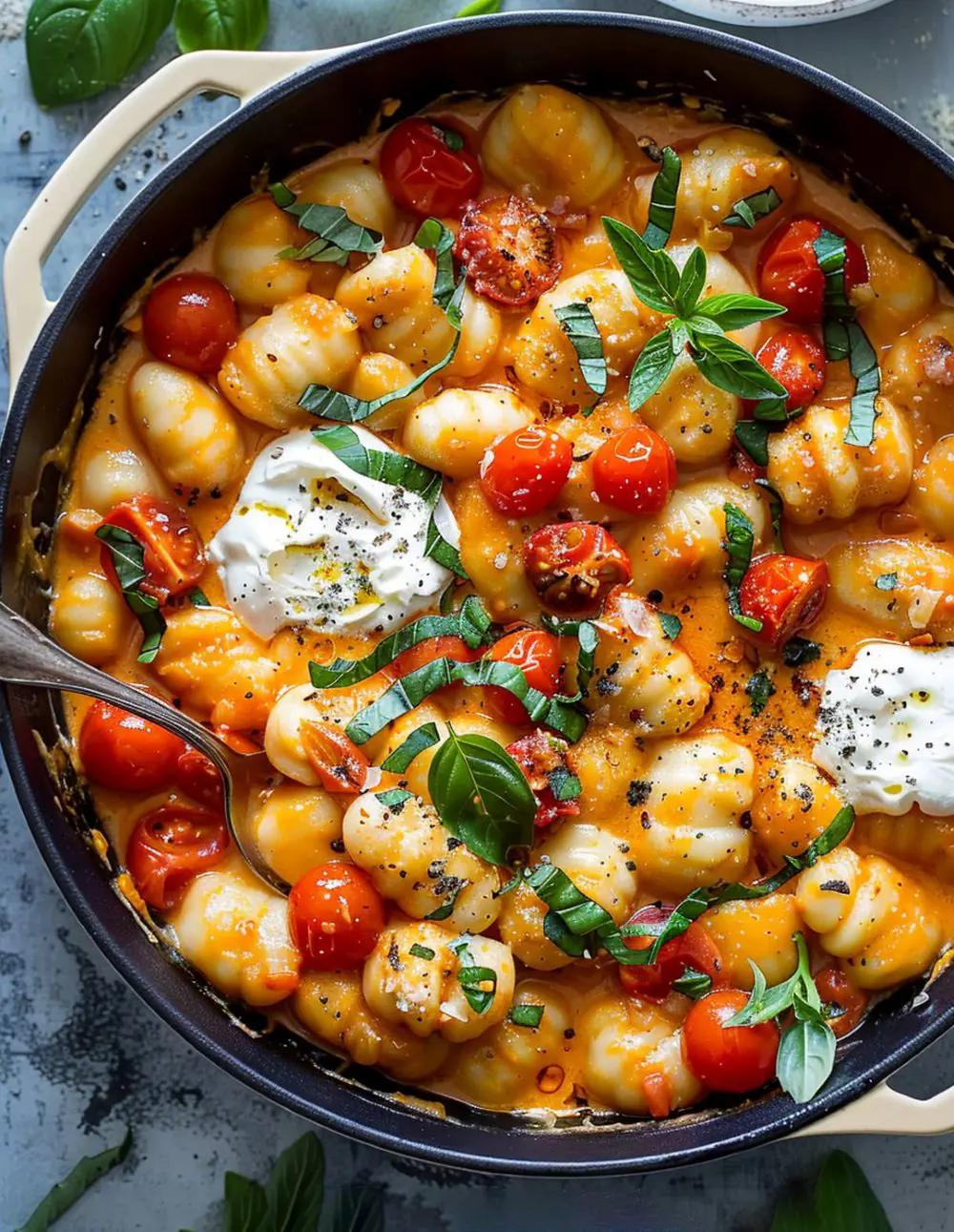 Toss gnocchi with fresh basil pesto and halved cherry tomatoes. Garnish with a few extra basil leaves and a sprinkle of pine nuts if you like. The vibrant, herby pesto brings a burst of flavor, while the cherry tomatoes add a juicy freshness. This light and flavorful option is great for a summer lunch or dinner.