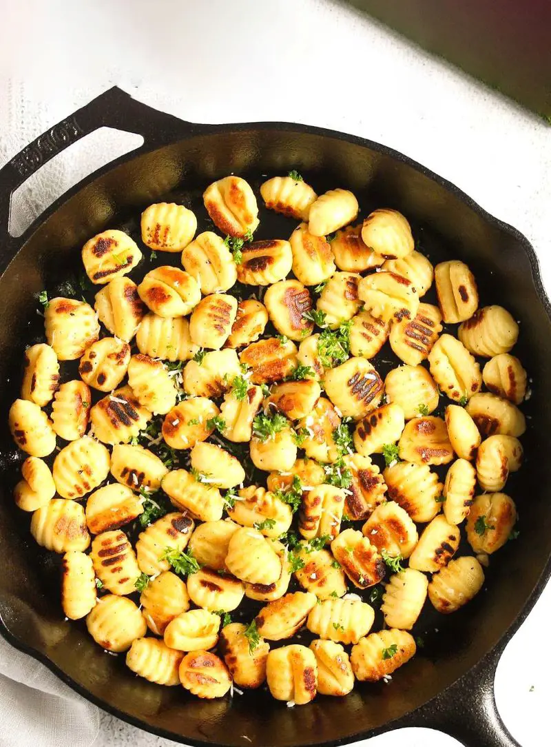 Transfer the sautéed gnocchi to a serving dish. Optionally, sprinkle with grated cheese or additional fresh herbs for extra flavor. Serve the gnocchi hot as a side dish or main course. They’re great with various sauces or can be enjoyed on their own.