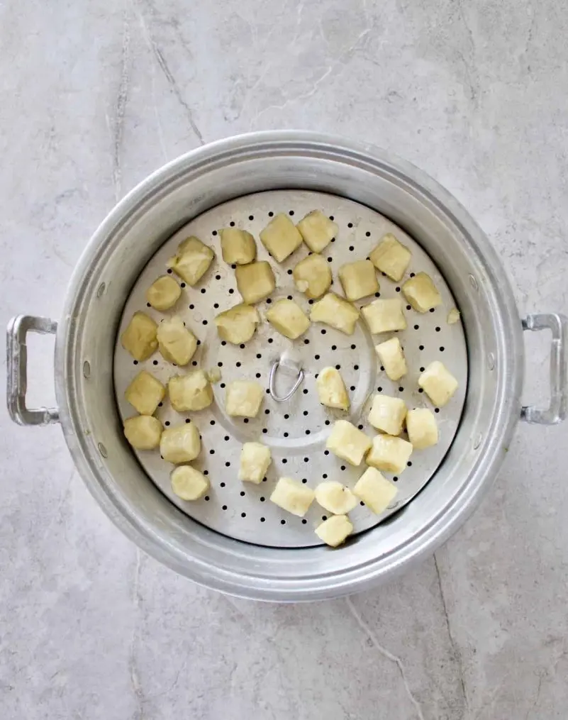 Carefully remove the steamer basket from the pot. Transfer the steamed gnocchi to a serving dish. You can toss them with a little olive oil, butter, or your favorite sauce.