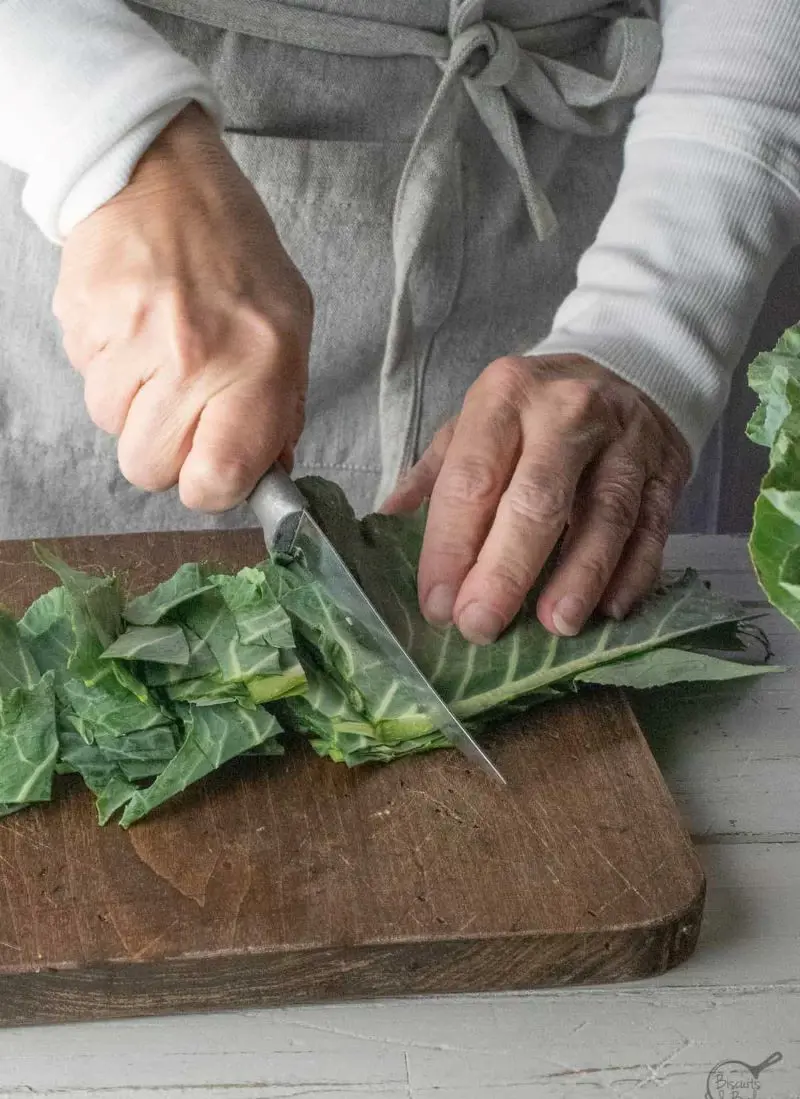 Start by washing the collard greens thoroughly to remove any dirt or grit. Remove the tough stems from the center of the leaves, then stack the leaves, roll them up, and slice them into 1-inch thick strips.