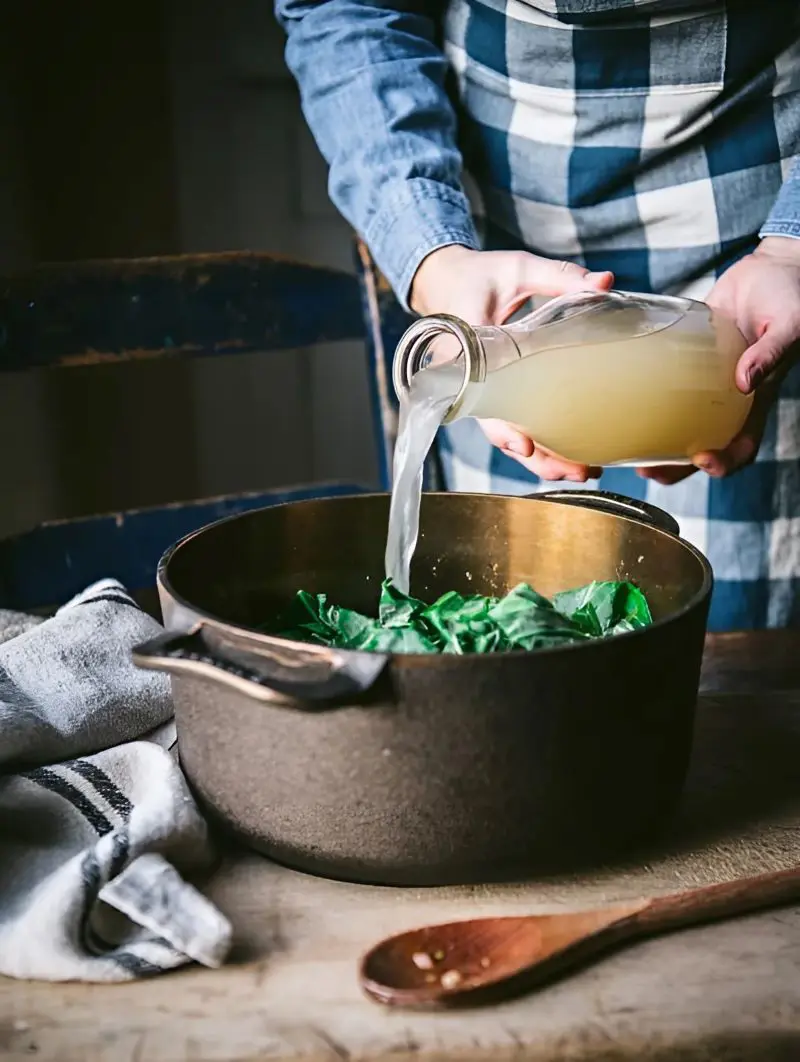 The broth, or potlikker, is full of deep, bold flavors that soak into the greens, making them very tasty. After cooking, the greens become tender and absorb all the flavors, creating a comforting and hearty dish.