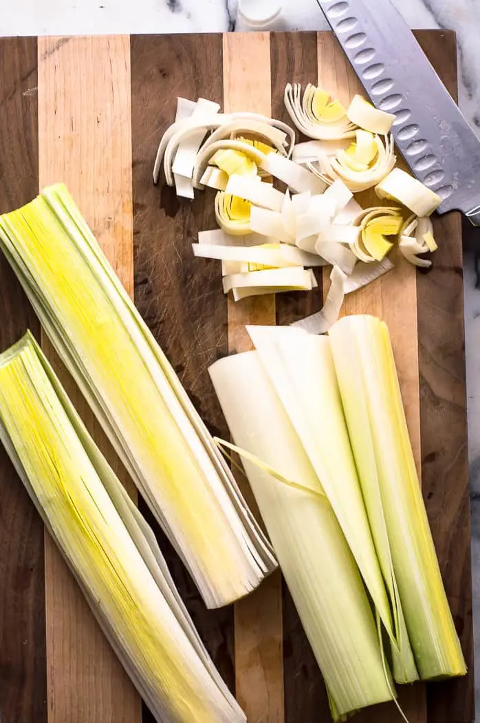 Trim off the root end and dark green tops of leeks, leaving only their white and light green parts.