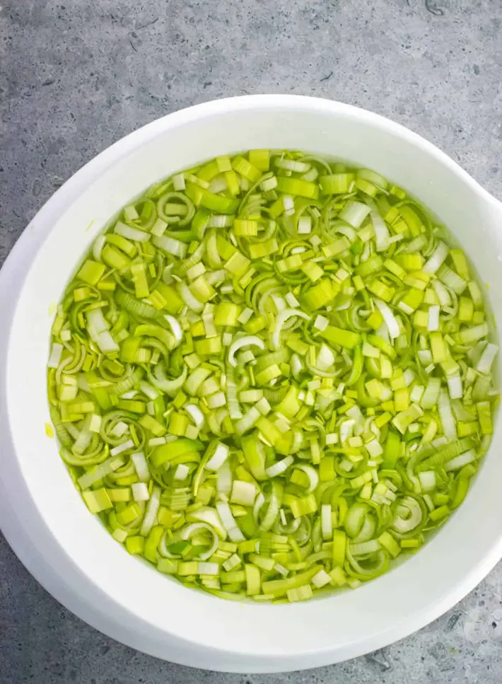 Cut off the root end and dark green tops from the leeks then properly wash them by always trimming and cleaning them leaving the white bits and light green parts. The leeks should be chopped into little circular shapes or pieces and then washed thoroughly to get rid of any dirt or grit.
