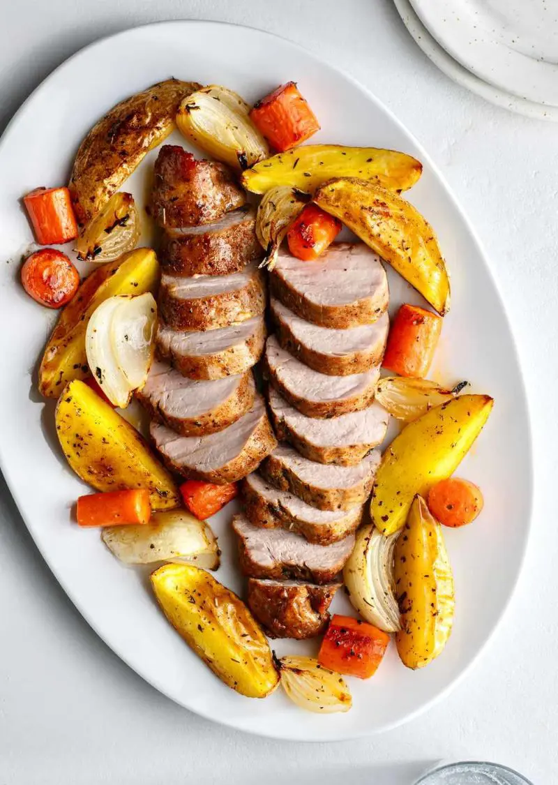 The natural sweetness of the roasted carrots and the earthy taste of Brussels sprouts balance the savory pork, while the potatoes make the meal more filling.