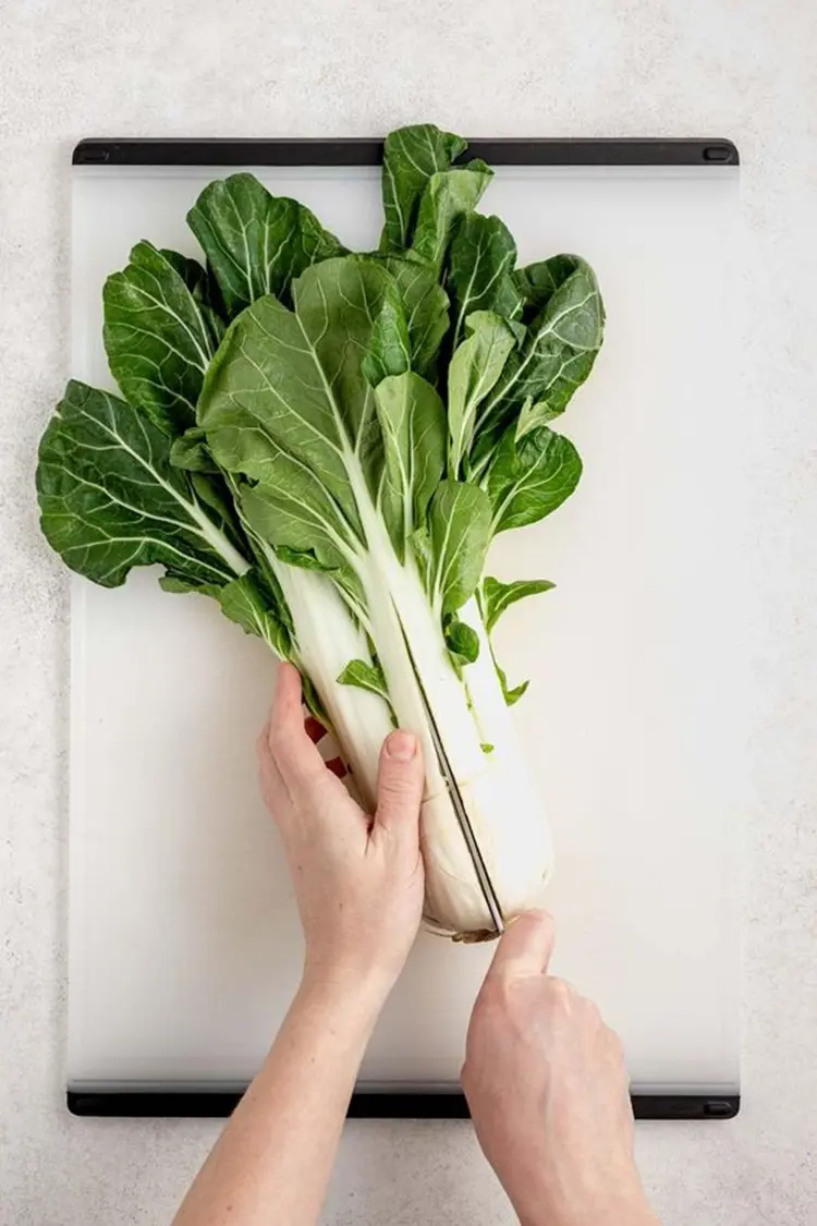 Use a sharp knife to remove about 1/4 inch from the base of the Bok choy. This will get rid of any tough or discolored parts. If using baby Bok choy, you may also skip this step if the base looks fresh and tender.