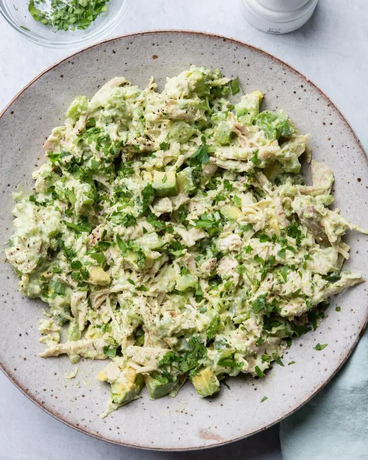 Now, let's talk about avocado chicken salad. Just mix some shredded chicken with chunks of creamy avocado, and add some color with diced red onions and cherry tomatoes. Likewise, garnish them with some crispy chopped celery for the perfect amusing crunch.