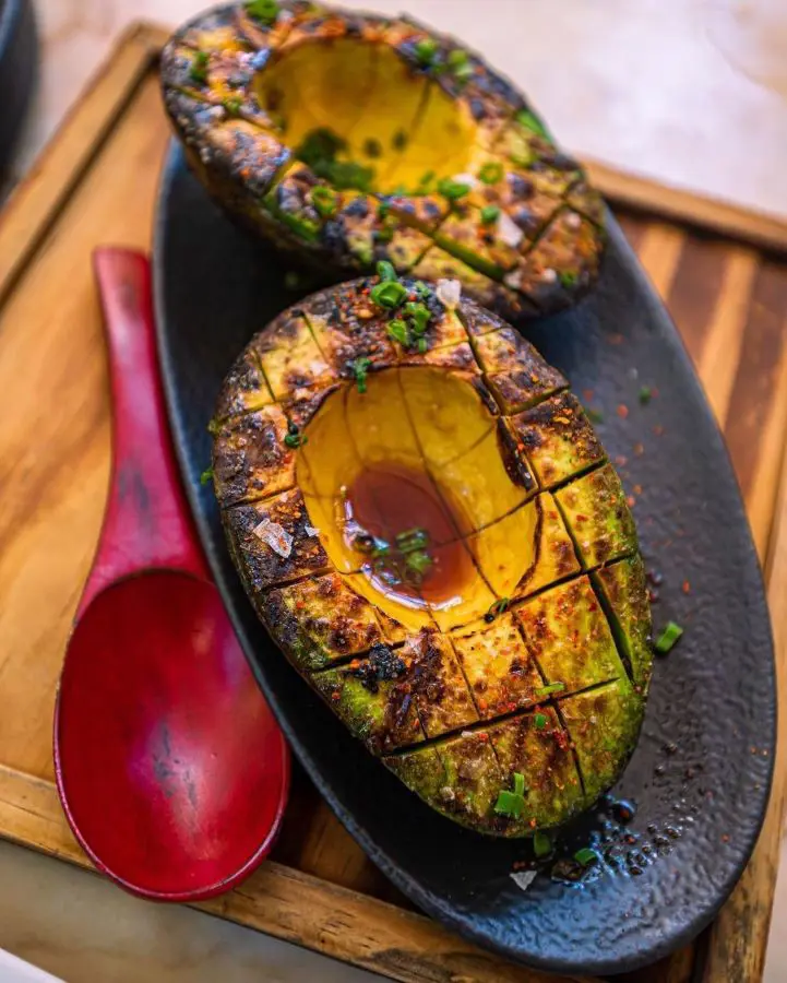This delicious dish is made so easily by first halving the avocados, then taking out the seeds, and lightly brushing the inside with olive oil and seasoning. Next, put them on hot grilling for approximately 3 to 5 min or until they get nice grill marks and a smoky taste.
