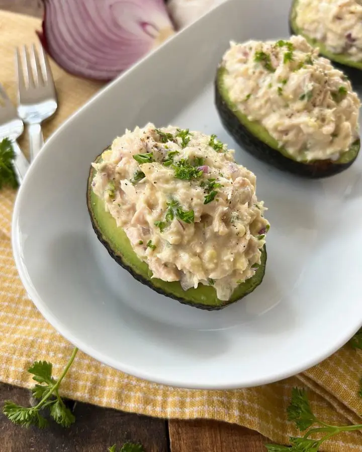 Stuffed avocados are seriously a flavorful way to enjoy this fruit. To make it, slice those creamy avocados in half, remove the pit, and fill it with your favorite ingredients. I love loading mine up with tangy tuna salad, crispy bacon bits, and a sprinkle of chili flakes for some tanginess (you can add some shrimp cocktail, quinoa mixed, black beans or corn, seasoned ground turkey, and roasted vegetables).