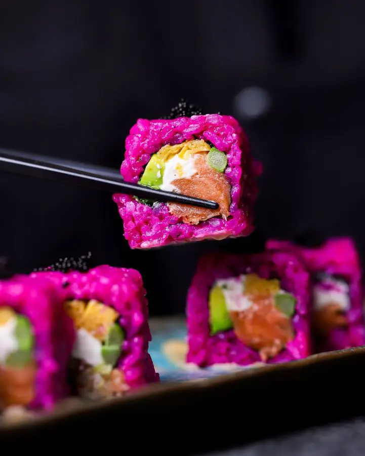 This creative idea highlights the special look of dragon fruit and adds a tropical touch to your sushi. Thus, it is a great choice for anyone who wants to try something new in the kitchen.