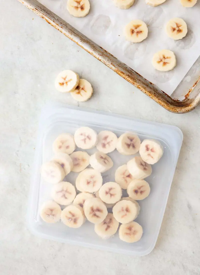 Freeze: Put the sheet pan within the freezer and allow the banana pieces to freeze solid, which needs to take about 2 hours depending on how thick they may be.