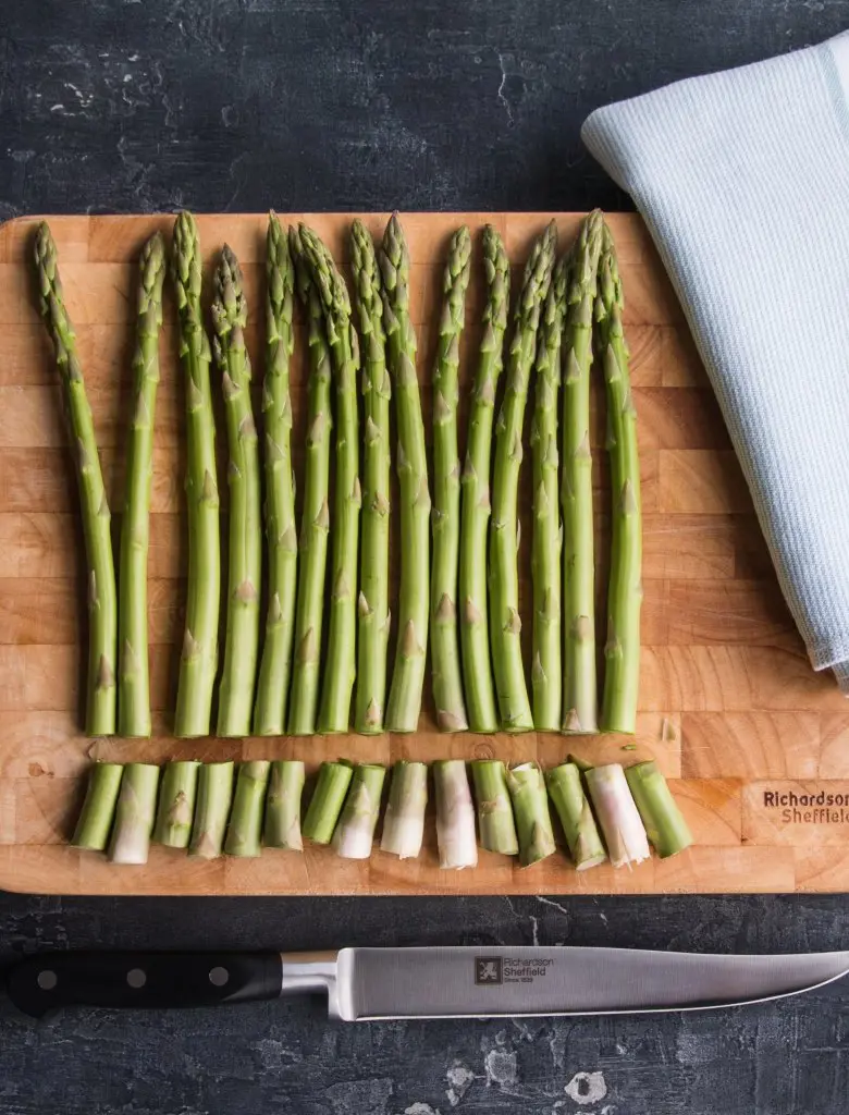 Natural Trimming Technique: No knife is needed to trim the asparagus. The asparagus tells you exactly where to trim. Hold each spear near its end and bend gently. The stalk breaks naturally at the point where tender meets tough. This breaking point marks the perfect spot between fresh asparagus and woody stem.