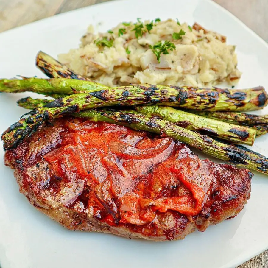 Garlic Butter Steak: Steak and asparagus make a good team on your plate. The butter melts over both the meat and vegetables. You get soft meat and crunchy asparagus in each bite.
