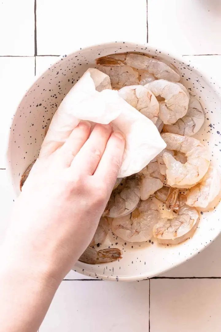 Pat dry the shrimp with paper towels. It is important that there be no moisture on your shrimp during grilling; any stored moisture will lead to cool, salty steam, which affects most grilled shrimp.