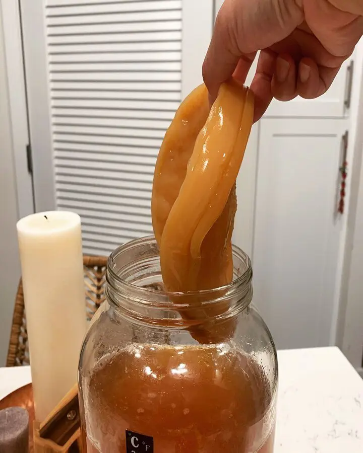 The prepared jar should then be placed in a cold warm temperature of around 21 degrees Celsius for about 1-2 weeks. This fermentation step helps you get a tangier taste. After the fermentation process, you should remove the SCOBY from the jar and make sure you take out 1 cup for the next starter.
