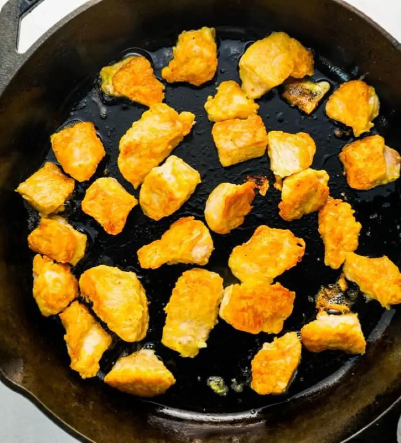 Usually, we tend to add all the pieces to finish it quickly. No, don’t do this. It will only overcrowd the pan and lead to uneven cooking of chicken. So, if needed separate whole chicken filets in 2 or 3 batches and fry separately.
