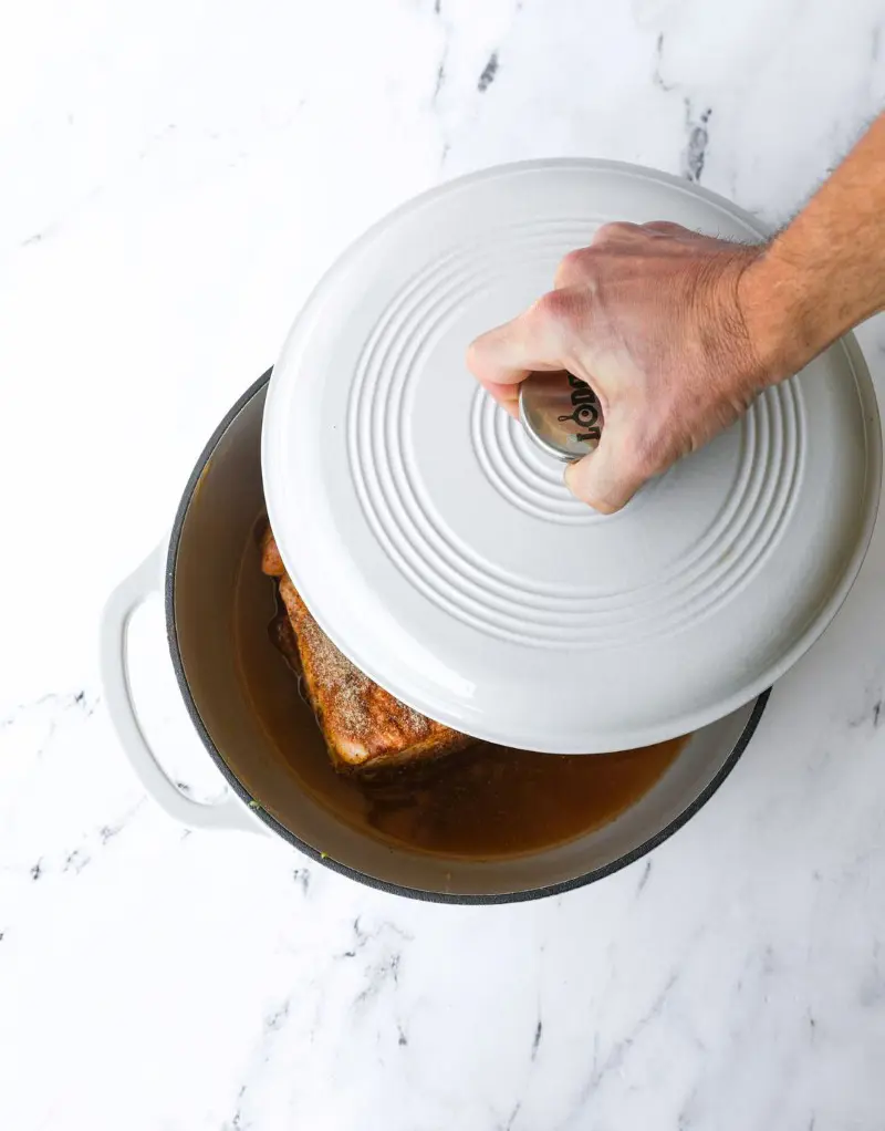 Your oven should be at 300°F. Put your covered pot in and let it cook for 3 hours. During this time, the tough meat fibers start to break down and get tender. After 3 hours, take the lid off. Now cook it for another 1-2 hours.
