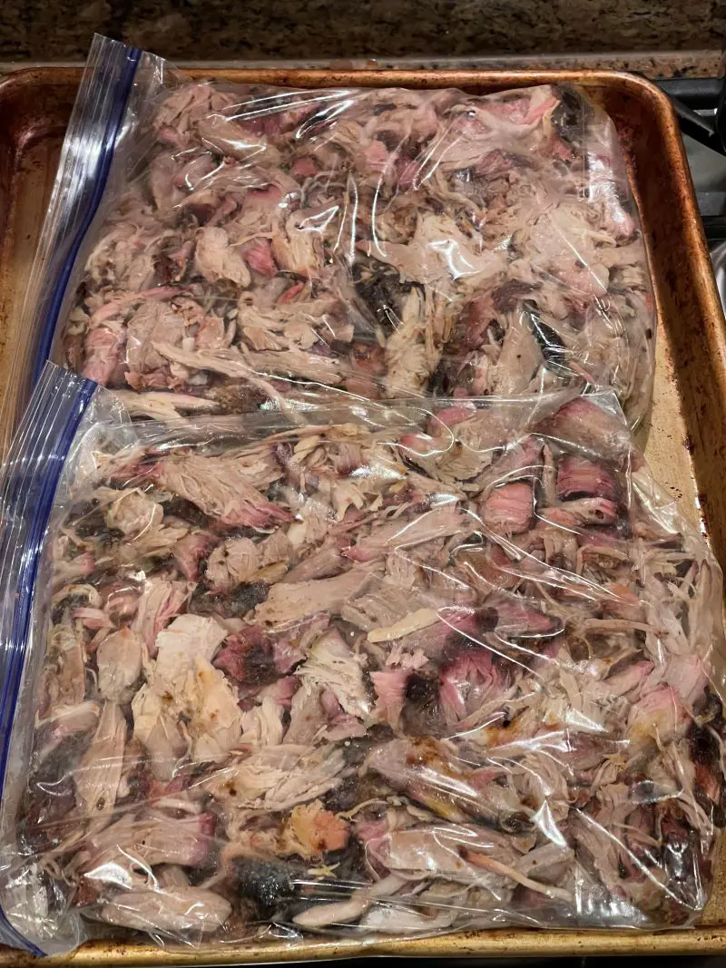 Portion your pulled pork into serving sizes you'll use later. Pack each portion in freezer bags, adding a spoonful of cooking liquid or sauce. Squeeze out all the air - air is the enemy of frozen food.