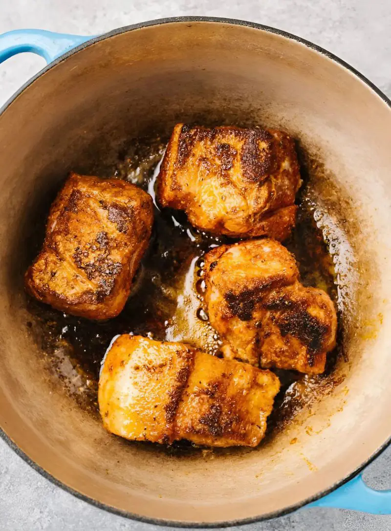 Let each side turn brown and crusty - about 2 minutes per side. Don't crowd the pot; work in batches if you need to. Keep an eye on it because the sugar in your rub can burn quickly. You're not cooking the meat through here, just developing flavor.