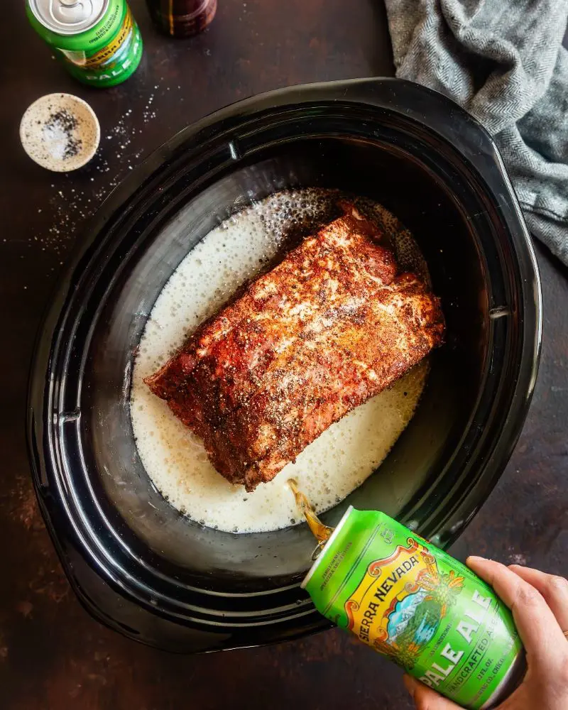 Pour a little oil into your slow cooker and place your seasoned pork inside. Add your beer (or broth) around the sides of the meat - you want about a half inch of liquid in the bottom. Don't pour it over the top or you'll wash off all those good spices.