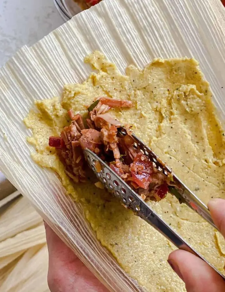 Add a small amount of filling to prevent problems during cooking. Too much filling can cause your tamales to burst open or leak while they steam, so keep portions modest and centered.